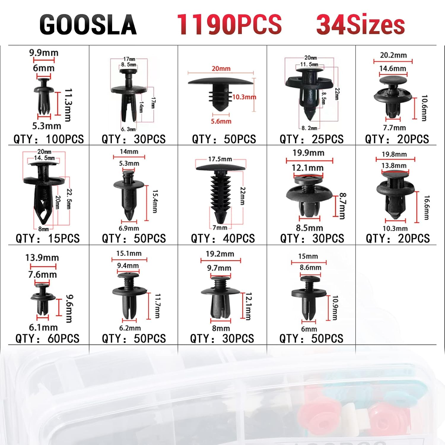 🚗【MOST COMMON SIZE】- 1305PCS great assortment push retainer kit including 34 most popular sizes, 4 different kinds tools with 1 Fastener Remover, fitting for door trim, radiator shield yoke, fender, bumper, side skirt, grille, engine cover and splash shield retainers replacement, compatible with Ford GM Toyota Honda Chrysler BMW Benz Nissan Subaru Audi Mazda, etc. But NOT ONLY for these cars, if the sizes and shape meet your requirement, it also works well.