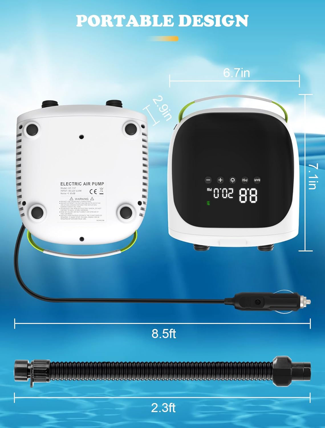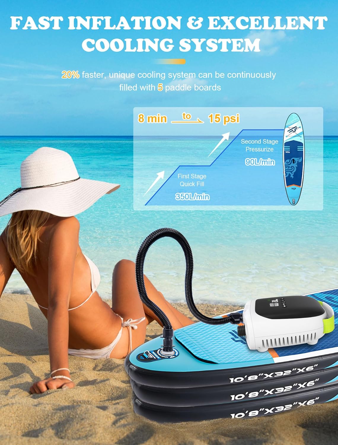 【Powerful Dual Motors】:This SUP pump features dual motors for fast and efficient inflation of your paddle boards and other inflatables. The cooling system prevents overheating and fills multiple SUP pumps.