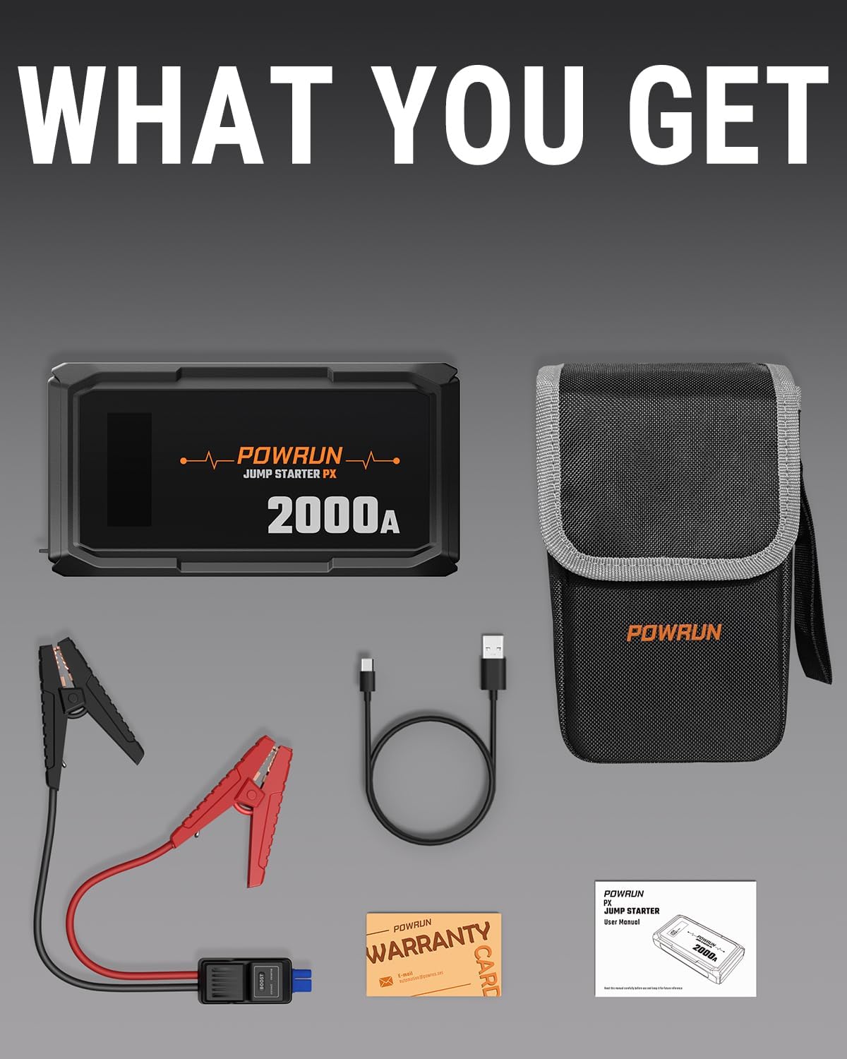 WHAT YOU GET – Powrun P-X Jump Starter, Intelligent Jumper Cables, USB A-C Cable, Storage Bag, User Manual, Two year after-sales service. Please email us for help if you have any questions, we will answer in 12 hours.