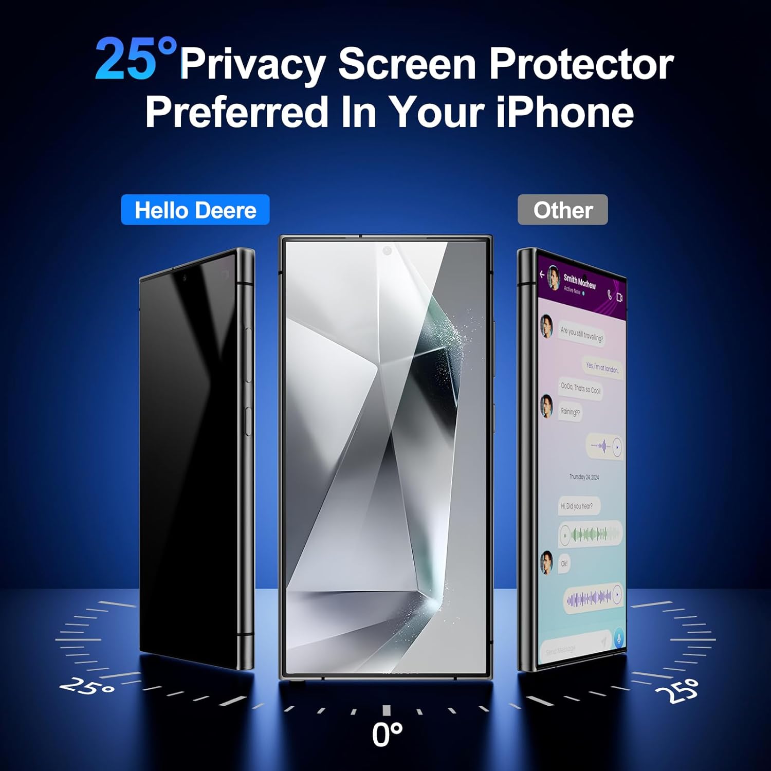 [25°Privacy Protection] HelloDeere for Galaxy S24 ultra privacy screen protector features cutting-edge 25°anti-spy technology,making your information to yourself.It provides 95% light transmission,designed AR anti-reflection and AF anti-fingerprint technology,offering a focused HD viewing Angle.