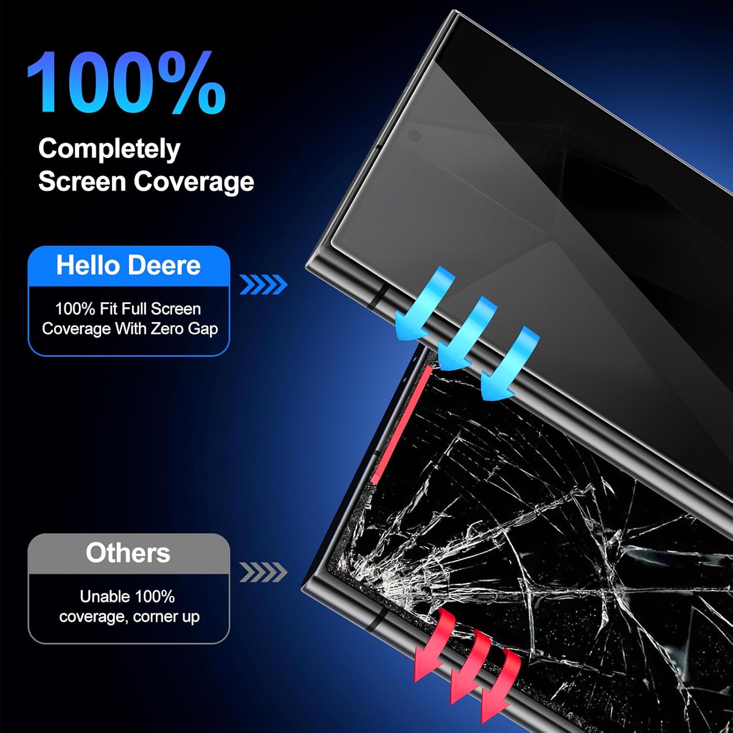 [Automatic Dust Removal]HelloDeere features a 1:1 3D curved black edges full Coverage HD Screen Protector for Galaxy S24 ultra.Easy installation designed with automatic dust removal technology,make install easily.No bubbles, no dust, no misalignment, 100% automatic dust removal in seconds.Please watch the installation video before starting.