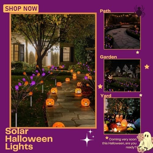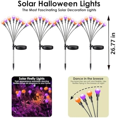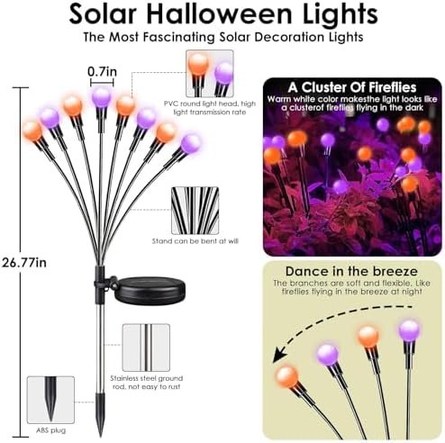 About this item SWAYING BY WIND: Solar halloween lights swaying by the wind, as if fireflies flying in the yard; The branches are soft and flexible, and the unique design structure allows it to sway with the wind. The combination of orange and purple colors can emit eerie lighting, creating a terrifying atmosphere and fun in Halloween decorations party. SOLAR POWERED: High-efficient solar panel: Waterproof halloween lights outdoor can work for 8-10 hours after being fully charged.The solar panel and lampshade are made of high-quality waterproof IP65 material. It’s specifically designed to withstand extreme weather conditions. Built-in 800mAh Ni-MH AA battery. TWO LIGHTING MODES: Halloween LED Lights are designed with two firefly lighting modes for your different outside decor. ALWAYS ON: Just put the button MODE, solar halloween firefly lights outdoor waterproof can keep continuous lighting at night. FLICKER ON: Just put the button MODE again, solar yard lights can flicker on continuously at night. ESAY INSTALLATION: Halloween solar lights do not require plugs, wires, or expensive installations. Simply turn the switch, connect the lights to the provided metal bars, and then plug them into the ground. THRILLING HALLOWEEN DECORATIONS OUTDOOR: Halloween lights for yard, gardens, patios, yards, paths, lawns and sidewalks and more.It greatly enhances the atmosphere of Halloween parties and is also suitable as a gift for friends and family, blending into the joyful Halloween.