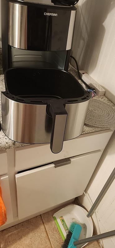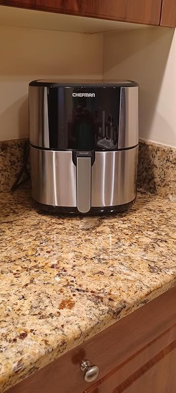 This is my 2nd air fryer. The first one I used only twice and gave it away. That was 3 years ago and since then I wasn’t motivated to have an air fryer. I became interested again when a friend mentioned to me how good her whole chicken came out of her Ninja air fryer. I’m a fan of roasted whole chicken. I decided to research the different brands like Ninja and Cosori. I wasn’t willing to spend too much money in case I ended up not liking the idea, again of using an air fryer. I’m not a gadget person. I wanted one that would roast a whole chicken and even a pork shoulder. Therefore, I didn’t need the double drawer kind. Also, I have a small kitchen and needed one that didn’t take up too much space.After reading the reviews of this Chefman, I was impressed, so I ordered it. Now that I have it I’m more than impressed. It’s FANTASTIC! I have not made the chicken or pork shoulder yet. But, I have made pork chops, steak fajitas with the veggies together, eggs, shrimp and grilled cheese. I love it! The taste is wonderful. It browns to perfection. It hardly makes any noise. There is no smoke and no strange smell. I haven’t used liners yet but it cleans easily. I wash it by hand and nothing really sticks. You can use any type of pans you use in a regular conventional oven and also the Pyrex glass type. The inside of the drawer is about 9″, therefore you can use pans and molds as large as 8″. I used one to make scrambled eggs. I have discovered that with this air fryer you only need this item to wash. While with pots and pans on the stove, you would need to wash them anyway, but besides that you also need to clean the stove.I keep my sandwich presser on top but remove it when using either one. This air fryer is big enough but doesn’t take a lot of space. Make sure you are aware of the dimensions and measure your space. This takes less space than the toaster oven I had there before.This air fryer is fantastic! It’s convenient with a great performance. I love it!I highly recommend 100%.