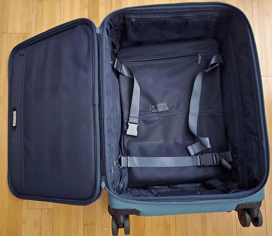 I feel almost silly for how excited I was to receive this Away softside carry-on. I’ve loved all the Away products I’ve tested, and this one is no exception. The fabric is a beautiful and durable dusty blue, the corners and handles are reinforced, and it rolls like a dream (even my toddler can push it around!). It’s pretty similar in size to the 22″ one, which makes sense since it’s only an inch bigger (see the pictures for a size comparison; it’s on the left). 22″ is the general max allowed size for carry-ons for major airlines for domestic flights, and 23″ is the general max allowed size for carry-ons for major airlines for international flights. I can fit 1-2 additional outfits into this one that won’t stuff well into the other one, which could be a big deal for a trip for which I’m only bringing a carry-on. Personally, I like having a bag that I can use for domestic OR international trips, so if I could only pick one, I’d go with the 22″, but having both, I’m happy to have the extra room for international travel. And everything packs tight thanks to the compressive layer inside and the durable clothes straps/buckles. There’s also the traditional mesh zipper on the inside of the “lid” part. Overall, there’s nothing novel about this suitcase, but it’s a classic piece of luggage that looks classy and quality.