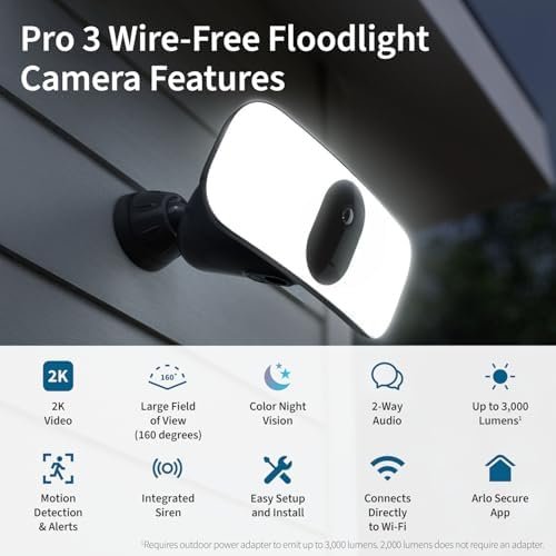 About this item Premium LED Floodlight Outdoor Wireless Camera 2K HDR Video (1 Camera): Watch, listen & talk. Monitor your home, property & keep your loved ones safe. 2K security camera built into this bright LED floodlight for all-in-one security. Protection: Protect alleyways, driveways, & other expansive areas with the convenience of a wireless floodlight. A complete home monitoring system, that is IP65 weather resistant, add additional cameras throughout your exterior & interior. Arlo protects your everything. Including your privacy: At Arlo, we are as passionate about privacy as we are about safeguarding your home & family. Arlo is designed to keep your personal information private and in your control. Don’t miss a moment with the Arlo Secure App: Get real-time notifications with motion activation & live video streaming in the Arlo app. Includes activing the siren remotely, Color Night Vision, large Field of View (160 degrees) & camera floodlight. See sharper details with 2K HDR (High Dynamic Range) Video & Zoom – Everything in picture perfect detail with the power to zoom 12x on every image to make out faces or license plates. HDR lets you view the brightest whites & the darkest blacks. Get more with an Arlo Secure plan (paid plan required): Share & store video for up to 60 days, know more with personalized alerts for Person & Vehicle Recognition, plus get alerts for Packages, Animals, and Fire Detection.¹ Expert support at your fingertips: Access help through the Arlo app and connect with our community to learn and share. 24/7 chat support available via app or website. Product use & support for United States only. Connect with your favorite smart home partners: Works with Amazon Alexa, Apple Home, & Google Home. Get more from Arlo with IFTTT automations such as receiving low battery notifications & turning on compatible lights when motion is detected.²