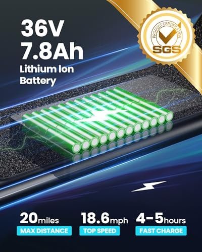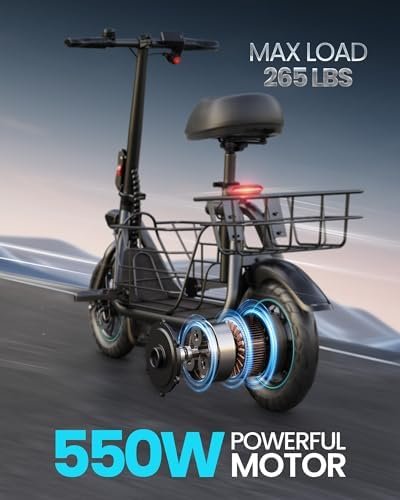 About this item Premium Performance: Electric scooter with a powerful 550W motor and a long-lasting battery for up to15-20 miles range at a top speed of 18.6 mph. The adjustable seat suits riders from 5’1″ to 6’1″, and the soft, breathable material ensures comfortable, fatigue-free travel. Ample Storage & Smooth Ride: The scooter features a large detachable middle basket and a small rear basket, offering plenty of room for cargo. The 9.5″ wide deck can accommodate a small pet. Ride smoothly with our thick, shock-absorbing 12″ tires. Enhanced Safety Features: Stay safe with our high-brightness headlight, rear brake light, an effective dual disc brake system, and an exclusive bar lock that prevents accidental dislodging of the stem. Our scooter is UL2272 certified, meeting stringent safety standards. Portable & Durable Design: The scooter’s sturdy metal body supports up to 265 pounds. With a foldable handlebar, storing and transporting this lightweight scooter in your trunk or on public transport is easy. Informative Digital Display: Keep track of your ride with the real-time LCD display that shows battery level, current speed, speed mode, and mileage. The screen is legible even in sunlight.
