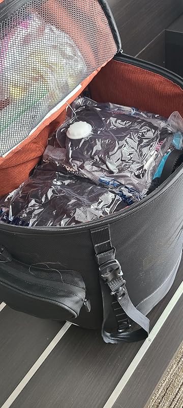 I’m not impressed by this variety pack of vacuum bags. I’m leaving this review after a year, when most of the bags are gone. That means I’m writing these details from memory, and some details aren’t 100% accurate. But my memories of these bags leave a lot to be desired. They do exactly what they say, and I did get some good usage out of them. There weren’t any major flaws that made me want to return them, and the product page was accurate. You know exactly what you’re getting. However, I struggle to imagine myself using these bags more often or buying replacements when the last few inevitably break. You’re probably better off buying multi-purpose plastic storage containers, a specific size of bag, or changing your plans entirely.I used these bags for long term storage, for packing a backpack and suitcase on multiple flights, and for saving space on a super long road trip. All of those use cases have some major “maybe don’t do that” problems. I definitely would have struggled more on my road trip without the bags, but that’s because I made terrible plans and ended up having to pack too much of my old apartment into my car. In another review, I said to pack less stuff. That also applies here. I’d you’re considering these bags for very limited space travel, don’t.After using the bags multiple different ways, I realized you realistically only need 3 sizes. The super small hand-compression bags that don’t need a vacuum because you squeeze them with your arms, a medium sized bag for smaller items like multiple shirts, and a mega big bag for large towels and blankets. All the other random sizes are just clutter when you’re looking for a bag that will hold several towels and you accidentally grab a large bag instead of a jumbo bag. So that’s one negative mark on the bags. The package includes way too many weird sizes. It’s perfect if you only need one specific size, but you’ll probably struggle to actually use all the bags effectively. So it makes the value proposition a bit rough. You’re buying a combo pack, but some of it will just become trash. If the manufacturers are reading this, make the three sizes color coded, so you can always grab a specific size from the pile of bags. That would help a lot. You can always leave part of the bag empty, and fold up the unused part. So having more bigger bags would be better.The problem with using the bags as long term storage is that they slowly re-inflate. The valve doesn’t hold in air over a long time. The manual that came with the bags says you should re-vacuum the bags after a while. I forget if it’s 6 weeks or 3 months, but the bags will never hold their vacuum if you store winter clothes inside, which is a major strike against using these for storage. I understand the laws of physics make this a nearly impossible task, but I must ask what the purpose of long term storage is when you need to re-pack your stuff every few months. At that point, just use a different storage method. The bags still hold some vacuum after 6 months, but they’re less “TV infomercial shrinking magic”, and more “big ziploc bag” after they settle in. So a big box is probably just as good.The problem with traveling with vacuum bags, is the traveling part. On an airplane, the weight is a major problem, and you might get caught with an overweight bag if you compress too much stuff into your suitcase, like I did. Plus, it’s just annoying to travel with too much stuff. The more you try to cram into your suitcase, the worse your travel experience will be. Repacking vacuum bags in a hotel before a flight is the worst thing ever. Plus, you need a portable vacuum. I got one of those too. Please, learn from my mistake and pack less stuff. You probably don’t need it, and you can just do laundry on the trip. With one exception I’ll explain at the end.On the road trip, the bags were just as much a liability as an asset. That’s where I found out that vacuum bags love snagging on random corners, and these specific bags love to get giant holes poked in them if they aren’t sitting on a nice flat surface. I broke around 3-4 bags on the trip, which was an unpleasant surprise that left me without enough large bags to keep everything compressed. Plus, I was hotel hopping, which made me realize how horrible it is to have to revacuum your bags when leaving a hotel. Seriously, just pack less stuff. Needing to buy things just to cleanly store the other things you bought is a sign you might have a problem. If you’re depending on vacuum bags to make everything fit ona trip, you’re eventually going to run into an unpleasant surprise when one of them breaks. You could pack extras, but with extra bags with bulky valves and a vacuum pump, you’re really eating into the extra space you thought you’d get by vacuuming all your stuff. These bags really aren’t good for traveling.The one exception for travel were the super-small bags you could hand compress. Those were actually great for hopping between hotels on a road trip. The bags don’t have the plastic valve, so they’re super thin and the empty bags fit anywhere. Instead of a traditional plastic valve with a locking cap, the travel bags use a valve at the bottom of the bag. They have a zipper at the top, but the bottom is technically open. There’s a long S bend at the bottom, and the two sides of the bag will stick to each other. You can force air out by compressing the bag like a balloon, which pushes the valve open to let the air out. But the sides of the bag stick to each other, and block air from getting back inside the bag. Ironically, those seem to hold their vacuum the best, although their design means that you can’t get anywhere as good if a vacuum. I needed some bulky winter pants, but only if I was going to be outside for a long period of time. I also needed to pack them in my backpack instead of my suitcase, so I could change clothes in the middle of the day. Being a