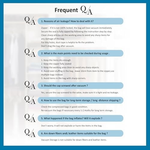 About this item Multi-use: Our vacuum storage bags are essentials for both household space saving and travel organization. Function as storage bags for clothes and compression bags for travel. Reliable protection: With the triple-seal turbo valve & double-zip seal design, our vacuum bags get the air out in the suction process. Can be used repeatedly. Hand Pump Included for Easy Use: Works with standard vacuum cleaner. Simply put the items in our storage vacuum bag, seal the zipper, suck out the air, close the lid. You can also use the pump included to easily vacuum storage your items. 20 PACK INCLUDES: 4 Jumbo: 39.35” X 27.5”(100cm X 70cm); 4 Large: 33.5” X 21.65”(85cm X 55cm); 4 Medium: 27.5”X 19.5”(70cm X 50cm); 4 Small: 23.5”X 15.7” (60cm X 40cm); 4 Travel Roll Up (No need vacuum holes): 23.5”X 15.7” (60cm X 40cm)