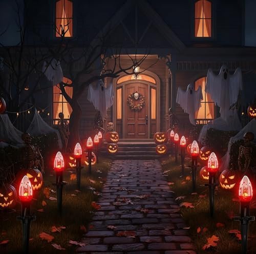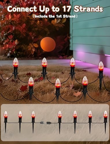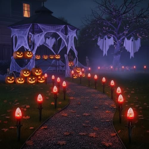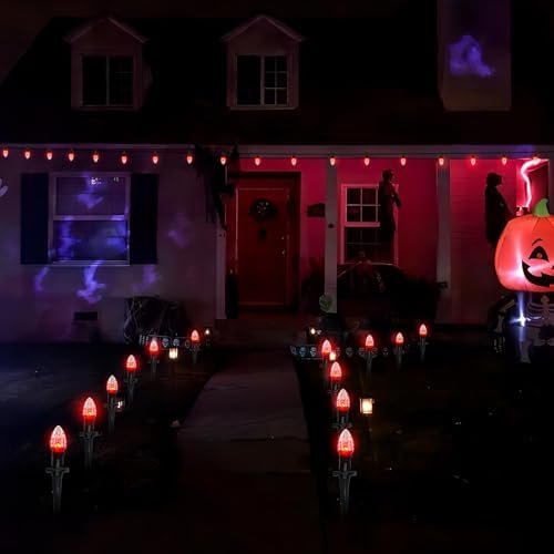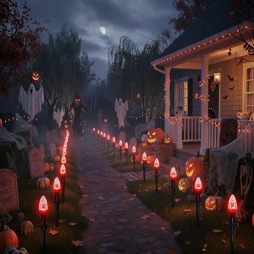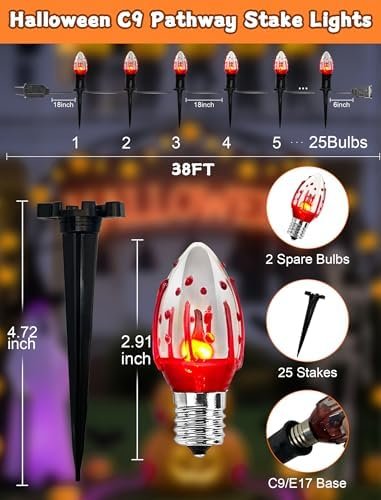 About this item Haunting Yard Decor: Transform your yard into a spine-chilling spectacle with our 38ft halloween path lights. Each of the 25 bulbs flickers like a flame, complete with a blood-splattered design to enhance the eerie ambiance. Perfect for creating a standout display, flickering flame string lights will make your yard the talk of the neighborhood. With 1 watt per bulb and a total length of 38 feet, you’re set for a hair-raising Halloween experience. Spooky Connections:halloween flickering pathway lights offer flexibility and ease with the ability to connect up to 17 sets, reaching a total length of 425 feet. Whether you’re adorning a small space or going all out on a large area, these connectable lights adapt to your needs. The plug-and-play feature ensures a hassle-free setup, allowing you to create a ghostly atmosphere with ease. Simply hang or plug them in, and let the haunting begin! Eerie Pathway Illumination:Illuminate your Halloween pathway with upgraded 25 C9pcs flame string lights. The enhanced stakes are designed for durability and easy installation, requiring just a single push. These flame lights not only withstand the elements but also add a spooky touch to your walkways, guiding trick-or-treaters through your haunted yard. Safe and Scary:Safety meets spookiness with our UL Certified Halloween lights. The black wire is UL Listed and certified for both indoor and outdoor use, ensuring your decorations are safe and reliable. Each socket base includes a built-in spare fuse for easy replacement, and we’ve included two spare bulbs, so your eerie display stays lit throughout the season. Versatile Horror: Indoor / Outdoor IP44 Waterproof Halloween Lights-Create a hauntingly festive atmosphere anywhere with our IP44 waterproof Halloween lights. Ideal for patios, parties, home decorations, restaurants, villas, and more,halloween sidewalk lights are perfect for both indoor and outdoor use. Decorate your garden pathway, patio, lawn, porch, gate, or fence to bring the spirit of Halloween to every corner of your space.