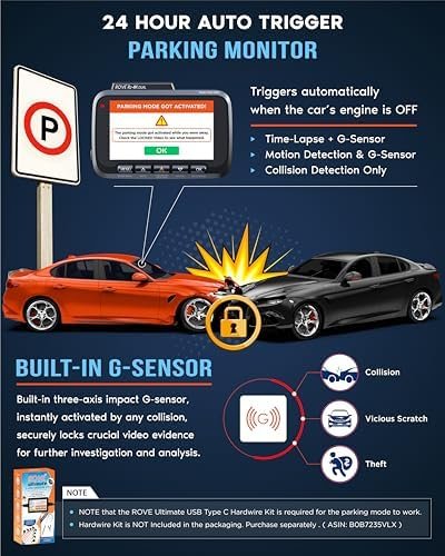 About this item 4K FRONT + 1080P REAR RECORDING – ROVE R2-4K DUAL dash cam offers dual-channel recording capabilities, capturing footage simultaneously from both the front and rear cameras. The front camera records at 3840x2160P @30fps, while the rear camera captures 1920x1080P @30fps footage, ensuring clear recordings of the road ahead and behind you. With a 150° ultra-wide angle for the front camera and a 140° angle for the rear camera, you’ll capture more of the road with this 4k dash cam. SONY STARVIS 2 SENSOR/SUPER NIGHT VISION – Equipped with a Sony IMX675 STARVIS 2 Image Sensor for the front camera, this dash cam delivers exceptional image quality with vivid colors and sharp details, even in challenging lighting conditions. Additionally, the front camera’s F1.5 aperture and the rear camera’s F1.8 aperture allow more light to enter the lens, resulting in brighter and clearer recordings, particularly in low-light environments. ULTRA FAST 5G WIFI/ UP TO 20MB/s DOWNLOAD SPEED – With its built-in dual-band 5GHz and 2.4GHz WiFi, you can use the ROVE dash cam app to view and manage dash cam recordings instantly on your iPhone and Android smartphone. By using the ROVE app, download your recorded videos directly to your smartphone at a speed of up to 20 MB/sec and then easily share these on social media with friends and family. Additionally, manage camera settings and update the latest firmware over-the-air via the ROVE App. CAR CAMERA WITH GPS – The new front and rear dashcam comes with built-in GPS which enables you to view real-time live speed and compass on the 3” IPS wide camera screen. It records precise driving routes, locations, and speed stamps directly on the video so you can watch dashcam videos with GPS data using ROVE’s free GPS Player on your PC or Mac & get additional evidence when you need it. FEATURES WITH STATE-OF-THE-ART TECHNOLOGY INCLUDED – Experience peace of mind with this front and rear car dash cam. It comes with a free 128GB microSD card and offers advanced features such as an f1.5 aperture, motion detection, G-sensor, seamless loop recording, emergency video lock, screen saver, live speed and compass direction, voice guidance, ring of threads for optional CPL filter, a built-in supercapacitor for extended product life, support for up to 1TB microSD cards, and many more. Our 24/7 CUSTOM DESIGNED PARKING MODE – R2-4K DUAL offers three options for its custom-designed 24hr parking mode with voice guidance. 1fps timelapse video, motion detection, and collision detection. A hardwire kit is required (buy separately, ASIN: B0B7235VLX). If an event occurs in the park, then the camera will record a full 1-min video, lock it safely in an event folder, and give you a voice alert the next time you start your car letting you know that event has occurred while you were away.