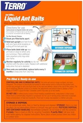 About this item ATTRACTS & KILLS: TERRO liquid ant baits indoor effectively target and eliminate common household ants, including acrobat, crazy, ghost, little black, odorous house, pavement, and other sweet-eating ants KILLS THE ANTS YOU DON’T SEE: TERRO ant bait is designed to share with the entire colony, eliminating both visible ants and those hidden, using liquid ant baits FAST-ACTING: Noticeable ant activity reduction within days as worker ants carry TERRO liquid ant baits back to the colony for widespread indoor ant killer effects READY TO USE: Simply place ant baits indoors with no setup required. Observe as Terro ant baits attract and eradicate ants conveniently at home VERSATILE HOME PLACEMENT: TERRO ant traps are ideal for use along baseboards, in corners, and on counters, targeting indoor ant baits hotspots throughout your home