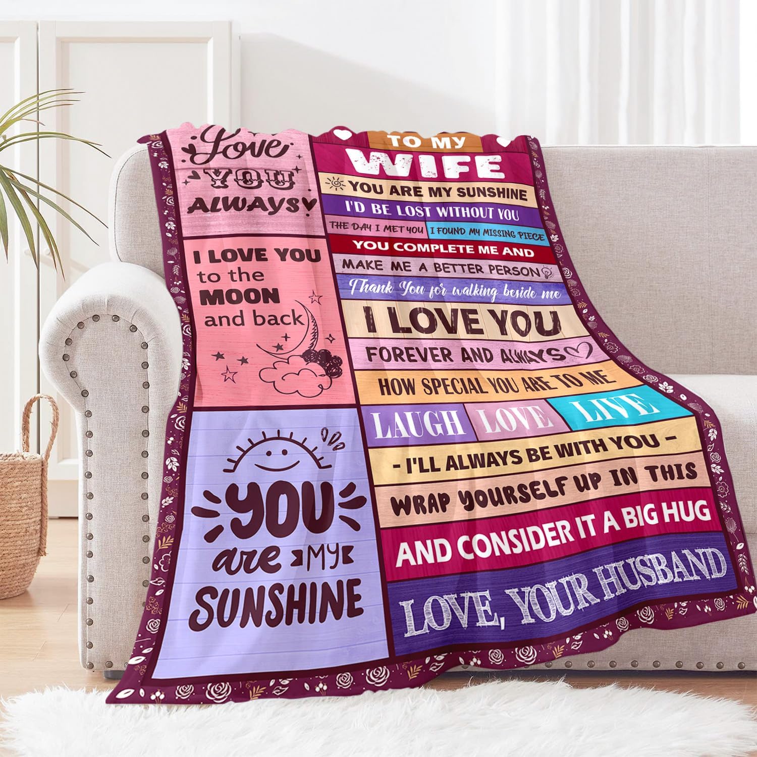 Unique and Sentimental Design: Unlike ordinary gifts, this blanket features a special message and unique design that makes it stand out. It’s an ideal wife gift idea, perfect for birthdays, anniversaries, or any occasion where you want to express your love and appreciation