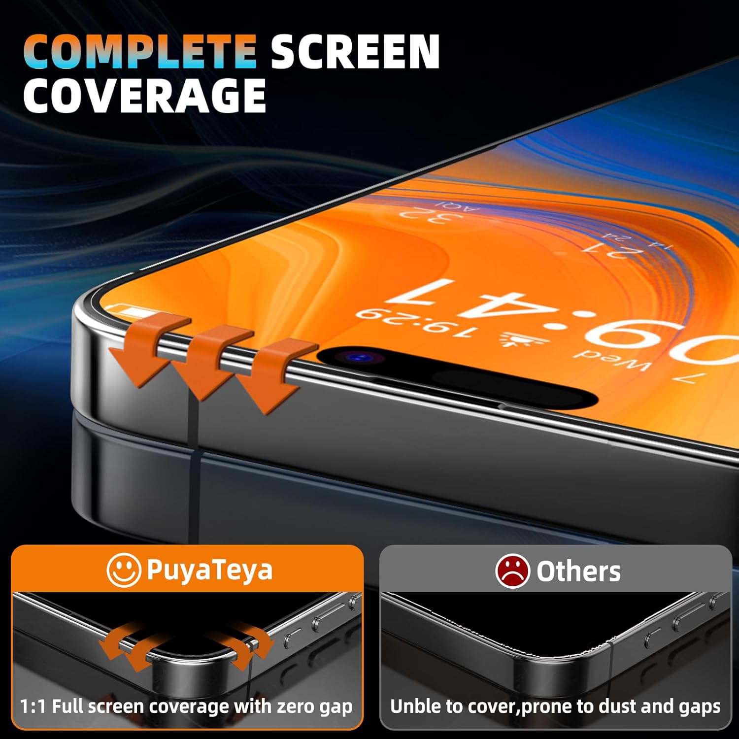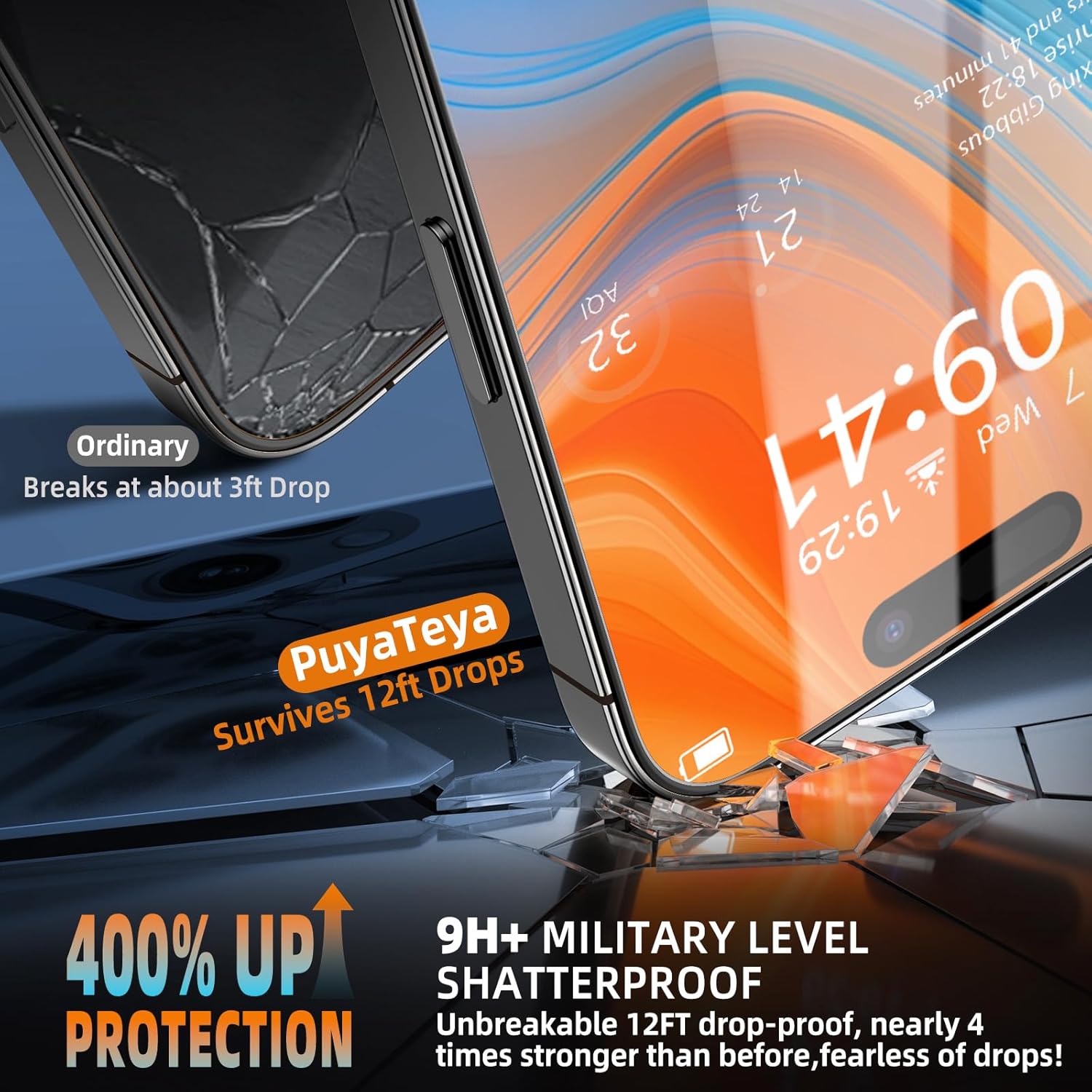 【Engineering the Unbreakable: The Science Behind PuyaTeya】 At its core lies an aerospace-proven 9H+ hardness glass formulation, reinvented for smartphone defense. ① Top Shatter Resistance ② Military-Grade Scratch & Wear Resistanc – Defies keys, tools, and daily abrasions③ Durability that is 7-8 times higher than other materials, Longest Durable. PuyaTeya builds a second tough screen for your iPhone 15 pro, choose us and you are choosing the best protection for your iPhone 15 pro